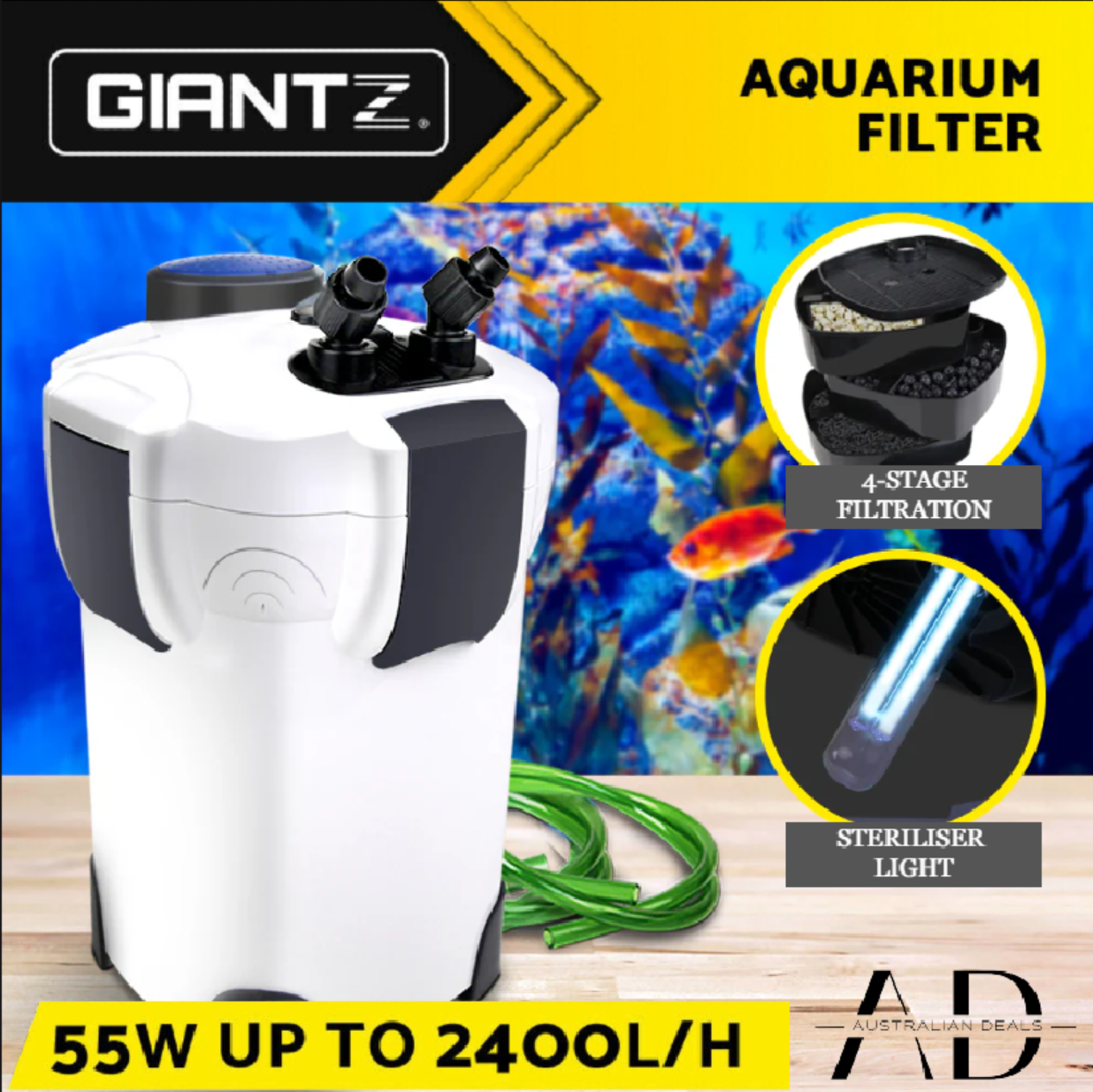 Once you start filtering your tank, you will begin to see clearer and purer waters and be able to take active control over your water characteristics. Best of all, it has a built-in UV steriliser light to expose passing water to lethal doses of ultraviolet and effectively kill many microorganisms.