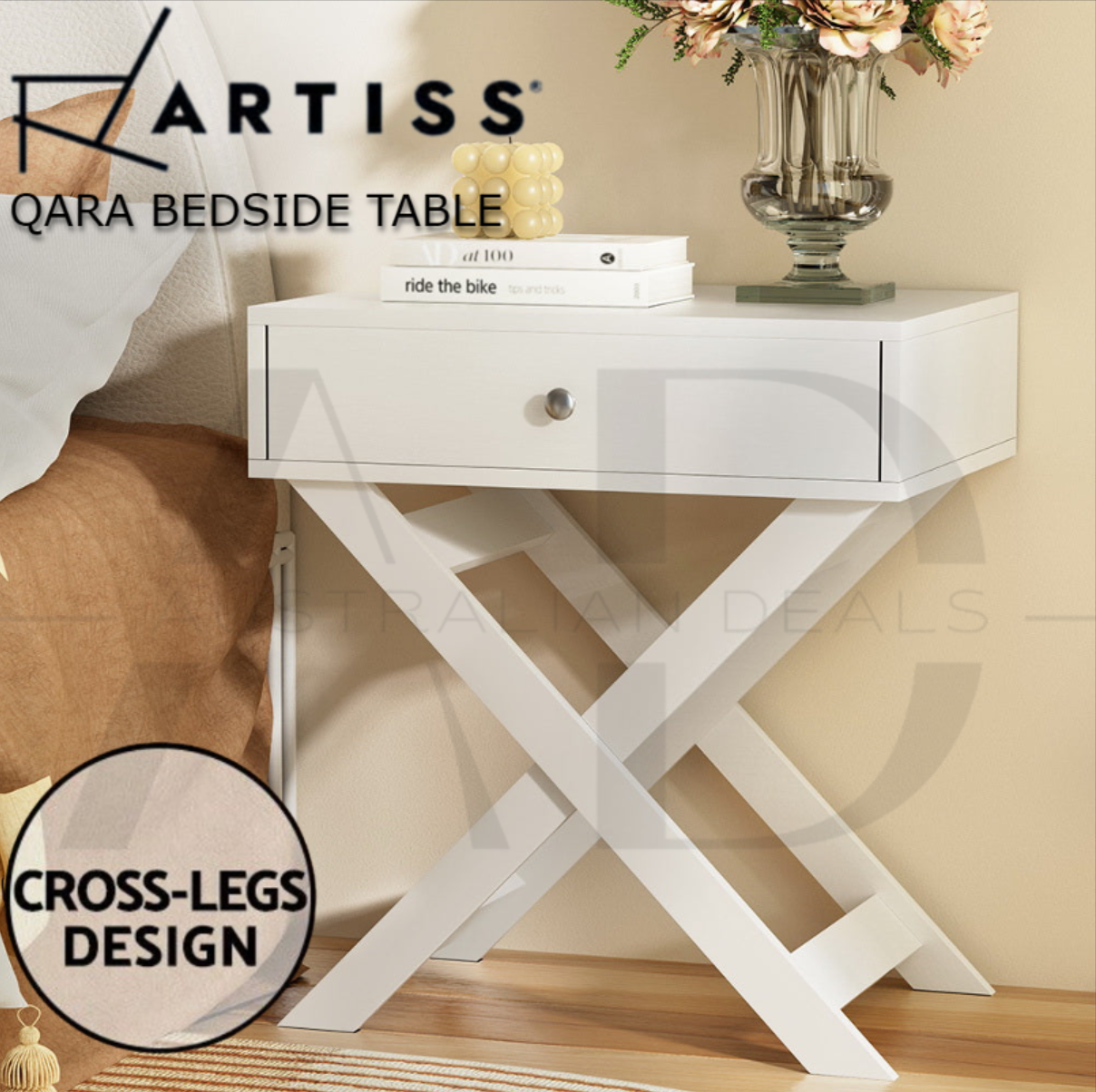 Many bedside tables look mundane and ordinary, but not our rustic retro-inspired Artiss Qara Bedside Table. Crafted from solid E1 particle board with a melamine finish, our bedside table is incredibly durable and built to last. The cross-legged design is not only uniquely stylish but also provides additional support. The generous-sized storage drawer is fronted by a sleek aluminium handle and opens smoothly to reveal ample space for your bedside essentials. The spacious tabletop has a weight capacity of 20kg, perfect for your favourite books, décor, or other trinkets.