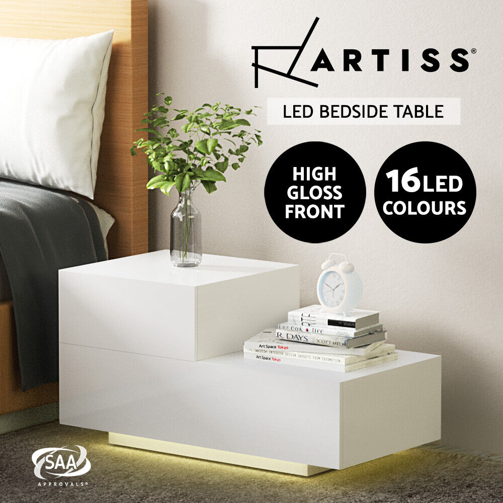 With a combination of unique structural design and maximum style, the Artiss LED bedside table is sure to make a statement with a clean aesthetic and contemporary style. Its built-in LED lighting is customisable into 16 different colours to match your mood. It will light up your room and prevent fumbling in the dark for a light switch in the middle of the night, creating a beautiful ambience you'll love. Our LED bedside table boasts a practical design that allows ease of use and convenience. The two smooth-sliding deep drawers have ample storage space to accommodate your belongings. They are like a treasure trunk, where you can keep your most-loved nighttime essentials. Featuring sturdy construction with thick particleboard and a high-gloss UV front, the bedside table is durable and easy to maintain. Not least, the handle-free design exudes a contemporary vibe that stands out from the mundane. Purchase this attractive LED bedside table today.