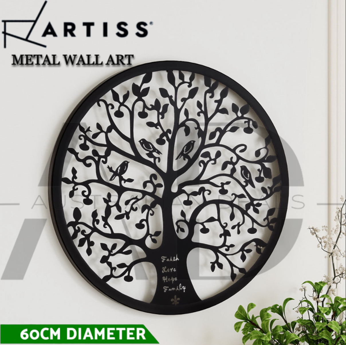 Crafted from high-quality metal, the wall art is durable and long-lasting, ensuring it will remain a cherished addition to your home for years to come. Meticulously designed, its sleek round shape and metal texture enhances interiors, blending modern aesthetics with timeless elegance. The tree-shaped piece features sleek black branches that support leaves, birds and other flora, with inspiring words carved into the base. Add to any room that needs a relaxing atmosphere or a space filler.