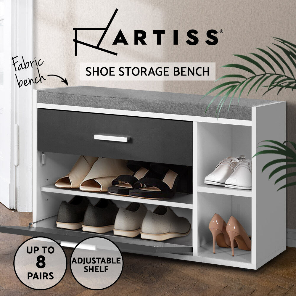 Get yourself a shoe storage cabinet with an aesthetic difference. Our Artiss Shoe Storage Bench blends two functions into one elegant piece. On first impression, it looks just like a plush stool. Yet, the bottom compartment with pull-down door and the two open side shelves provide you with ample space for up to 8 pairs of your favourite footwear (depending on shoe size). There is also a spacious top drawer with smooth anti-rust runners for all your other footwear essentials such as shoe polish and spare shoelaces. Made from quality particle board, the bench is sturdy and finished in smooth paper veneer for durability and easy maintenance. Best of all, its thoughtful design means that you can place it in your hallway or entrance for a neat and tidy look that blends seamlessly with your home décor. So remove the clutter and get organised with our shoe storage bench. We are sure it will feet right in with your discerning taste for all things stylish and chic.
