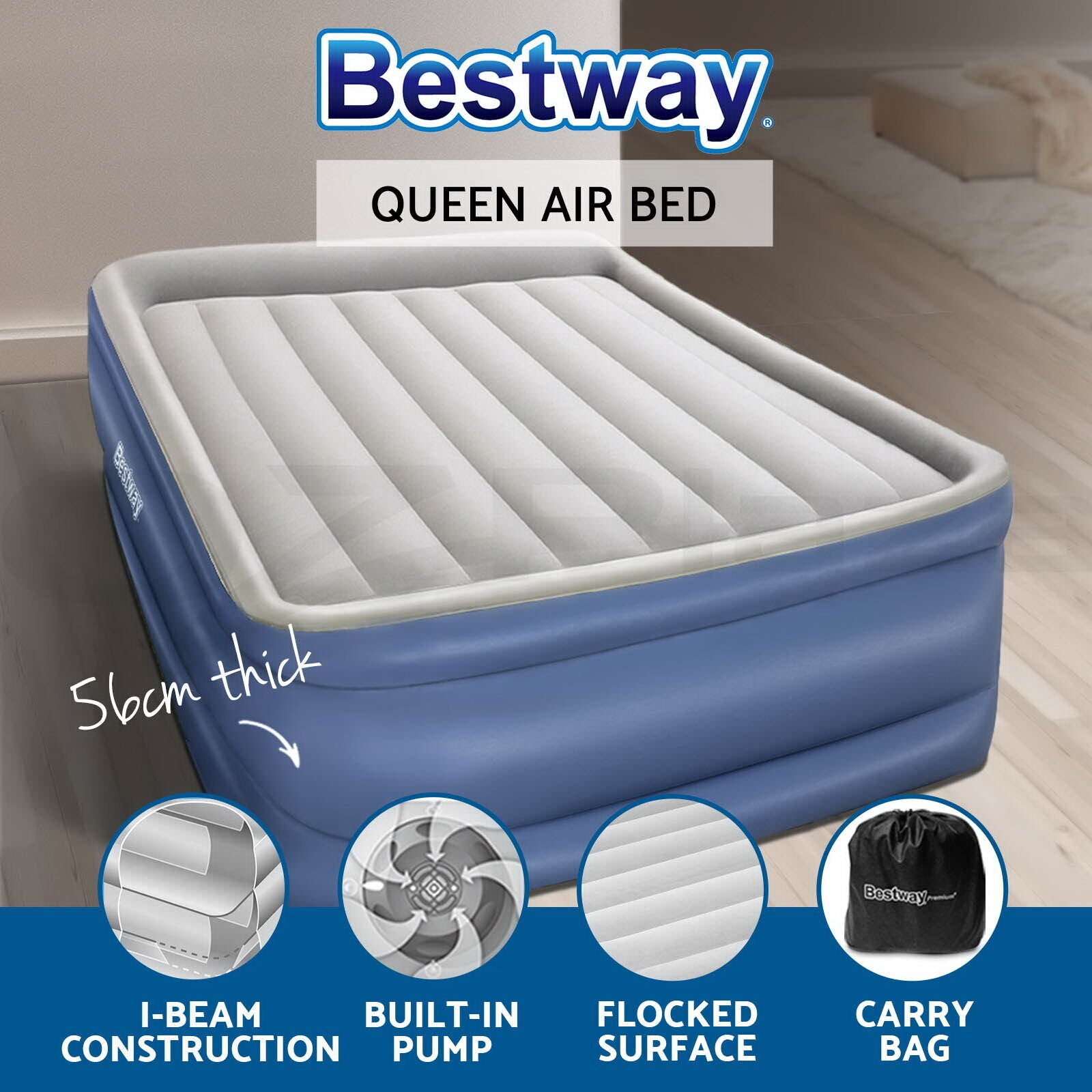 Upgrade your sleeping experience with the Bestway Queen Size Air Bed. Perfect for both indoor and outdoor use, this premium inflatable mattress features a flocked sleeping surface for exceptional comfort. The sturdy coil-beam construction ensures stability, while the built-in electric pump allows for quick and easy inflation and deflation in just 300 seconds. Designed with a unique rib and surround frame to eliminate roll-offs, this air bed is a practical, portable, and comfortable solution for any occasion.