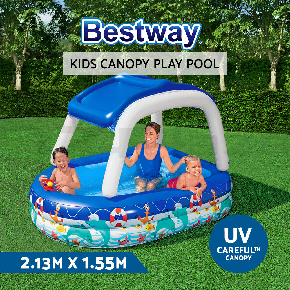 The Bestway® Sea Captain Family Pool offers the perfect way for families to enjoy water play together! Equipped with a UV Careful™ canopy, it keeps kids cool and protected while they have safe fun in the sun. The canopy is also removable, giving you the flexibility to use the pool with or without it.