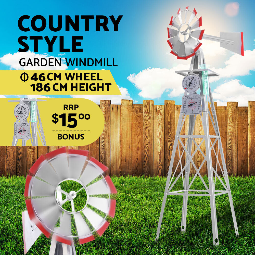 Enhance your backyard with the Garden Windmill, a unique and stylish decoration that adds charm while serving a functional purpose. Featuring a built-in weathervane, this windmill indicates wind speed and direction. Its 12 smooth-turning blades, powder-coated finish, and durable metal frame ensure long-lasting performance and visual appeal. Designed to withstand the harsh Australian climate, it’s both weather-resistant and rust-proof. Securely anchored with four stakes and cross-brace supports, this windmill stands tall against strong winds, making it the perfect addition to any outdoor space.