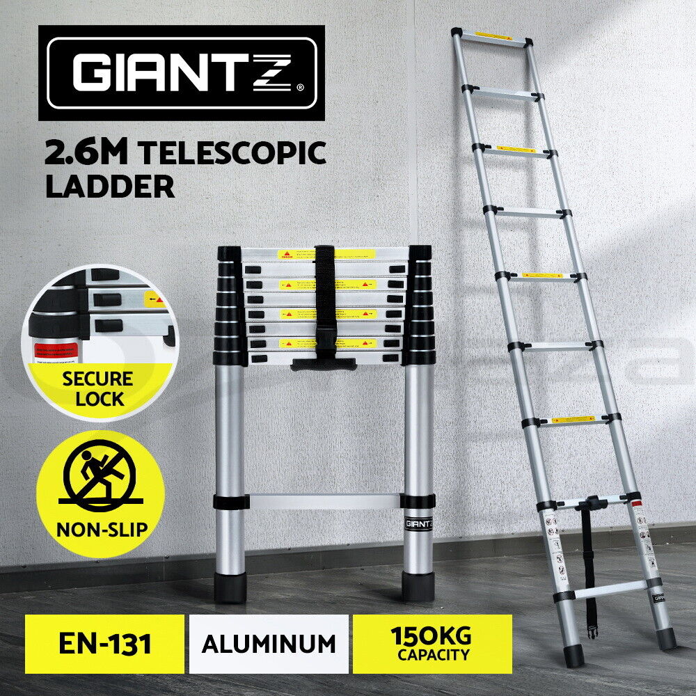 Climb your way to the top with the Giantz 2.6M Telescopic Ladder. Forget ladders that are heavy, bulky, awkward to store and hard to use - the Giantz Telescopic Ladder solves all your problems. Made from premium aluminium alloy and durable nylon fittings, the ladder is rust-resistant, incredibly stable and ready for all your DIY needs. The ladder fully extends to 2.6M and collapses neatly into an easy-to-carry 76cm tall, 5cm wide bundle with an easy-carry strap. The steps are a generous 4cm for stability and the legs are fitted with anti-slip end caps to prevent slippage and protect floors. The ladder has a secure lock to keep the steps in place, and a slow descent when collapsing to prevent trapped fingers. Easily reach high places in your home, in the warehouse, outside or on the road. Reach new heights with the Giantz 2.6M Telescopic Ladder.