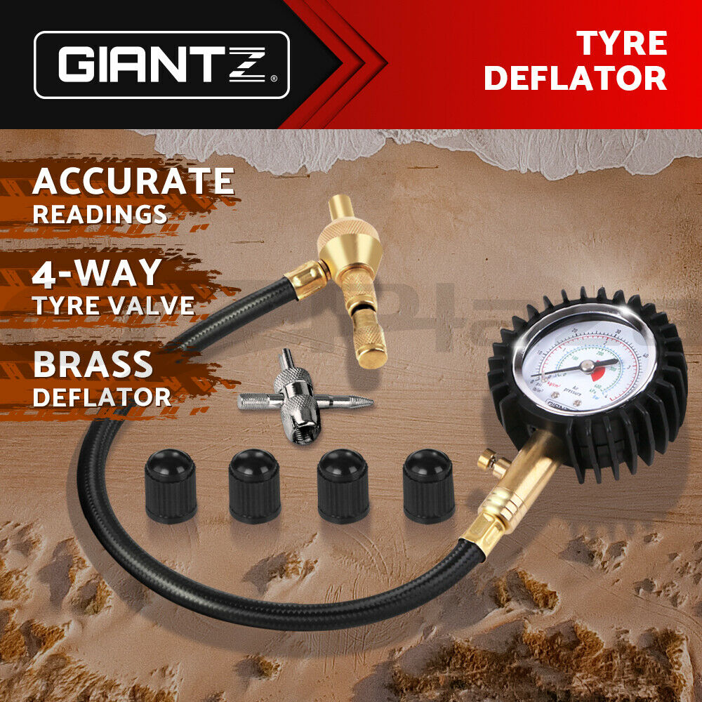 Featuring durable and corrosion resistant rubber housing with an operating range of up to 60PSI, the GIANTZ 2-IN-1 Tyre Gauge & Deflator allows you to quickly deflate large tyres to very low pressures while monitoring the pressure on the gauge. The gauge shows accurate tyre pressure in 5 measurement units; Psi/Kpa/Kg/cm2/Bar when the release valve is pressed. With precise control, it will deflate your tyre in 30 seconds! The GIANTZ 2-IN-1 Tyre Gauge & Deflator is very simple and easy to use with no additional tool required.