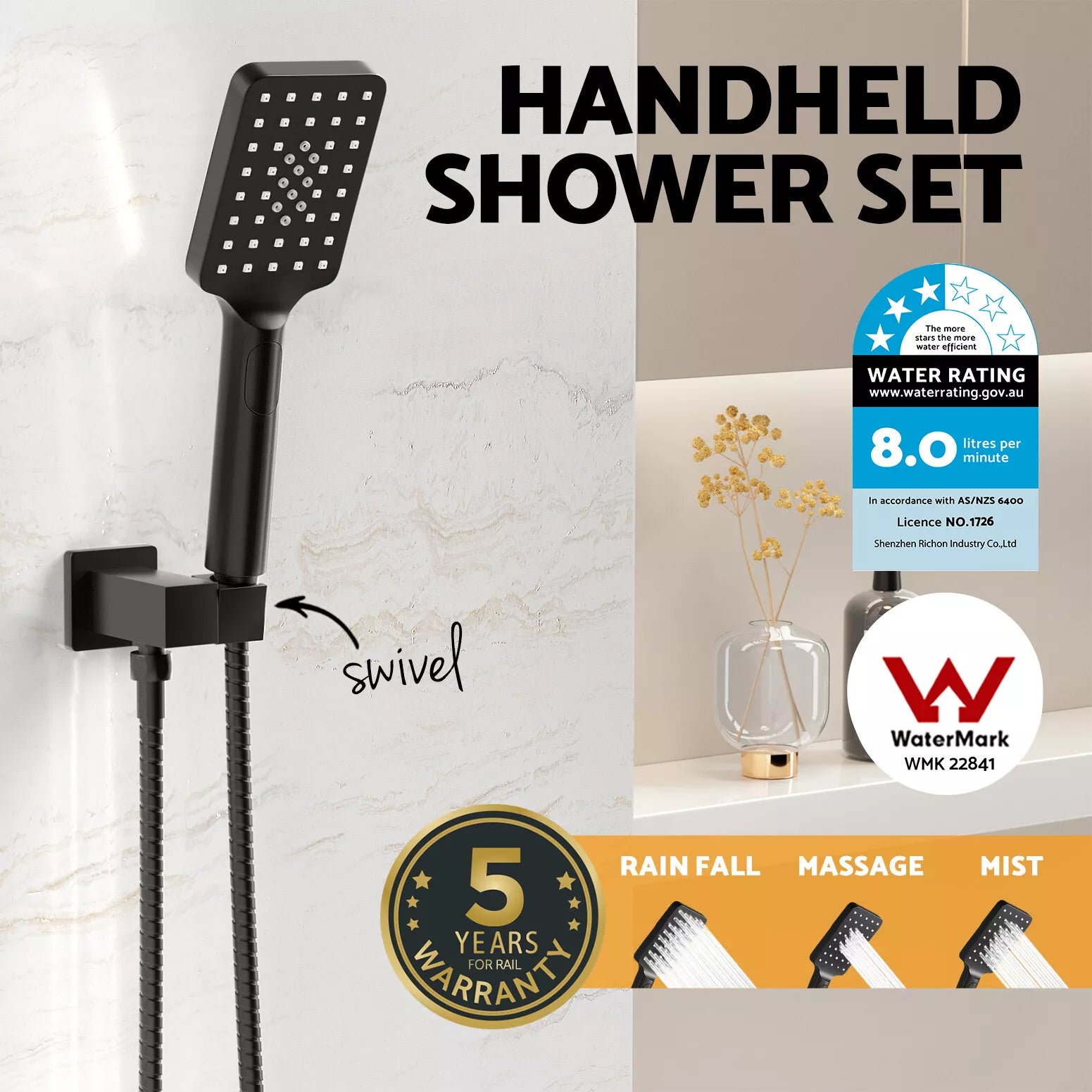 🔹 WELS star rating: 3 star and 8.0L/min