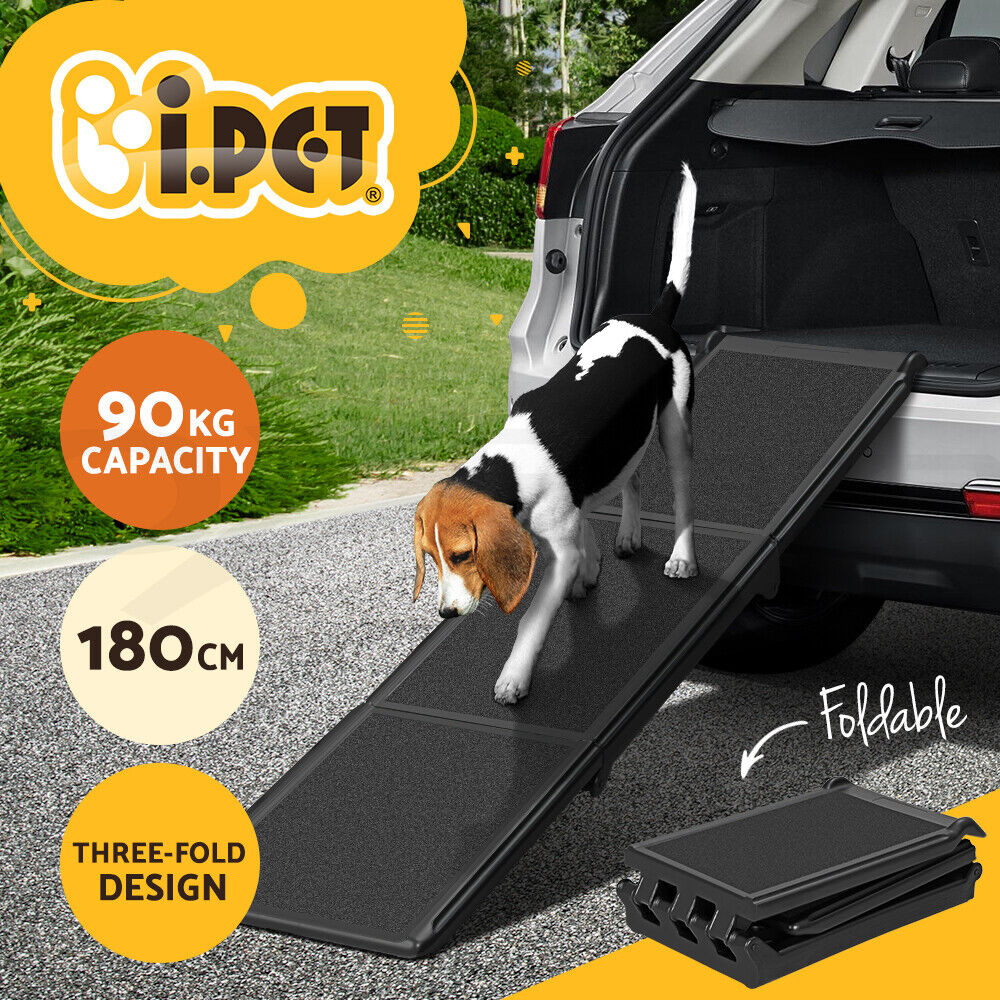 Joint pain is a common problem as your dogs start to grow into their senior years, which can seriously affect their quality of life. Your furry companions love to be by your side. But when you're on a couch, in bed, or in your car, it can get harder for them to reach you. Having to frequently climb up and jump down may damage and worsen their joint pain. Prevent your furry friends from getting injured with our i.Pet's dog ramp and steps. Made from quality eco-friendly polyethylene with matte finish, our dog ramp boasts sturdy structure and durable construction. It's suitable for both big and small dogs and has good weight holding capacity. The non-slip surface and a safety latch prevents accidental slips and ensures ultimate stability, and the water-resistant and temperature-resistant surface makes it suitable to use anytime. Our dog ramp is lightweight, and its portable design makes it easy to move around. Furthermore, it boasts a three-fold design, which makes it easy to store. Surprise your beloved pets with our i.Pet's dog ramp and steps today. It'll make them feel loved and cared for.
