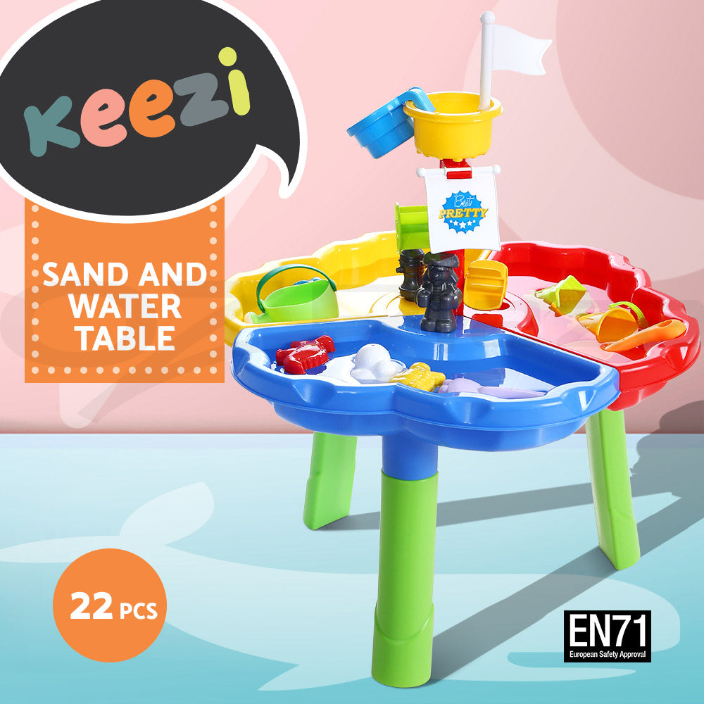 Your children will simply love our Keezi Sand and Water Table! With lots of individual pieces and many moving parts, the sand and water table takes your kids into a world sand and sea. Suitable for children three years and older, the sand and water table is designed and made in accordance with EN71 Safety of Toys certification standards. That means it is completely safe for your children with total peace of mind. Not least, the toy is also made of non-toxic and eco-friendly materials. Set it up in the backyard or bring it to the beach, the sand and water table's three-legged design ensures the assembly stays firm and steady on both sand and water despite its light weight. Your children will have a whale of a time playing with the waterwheel, rainy cloud and more. Better still, use the table and sand mould to create sandcastles for more whimsical imaginations. Neatly packaged in a colourful box, the sand and water table is the perfect gift for the season or any birthday event.