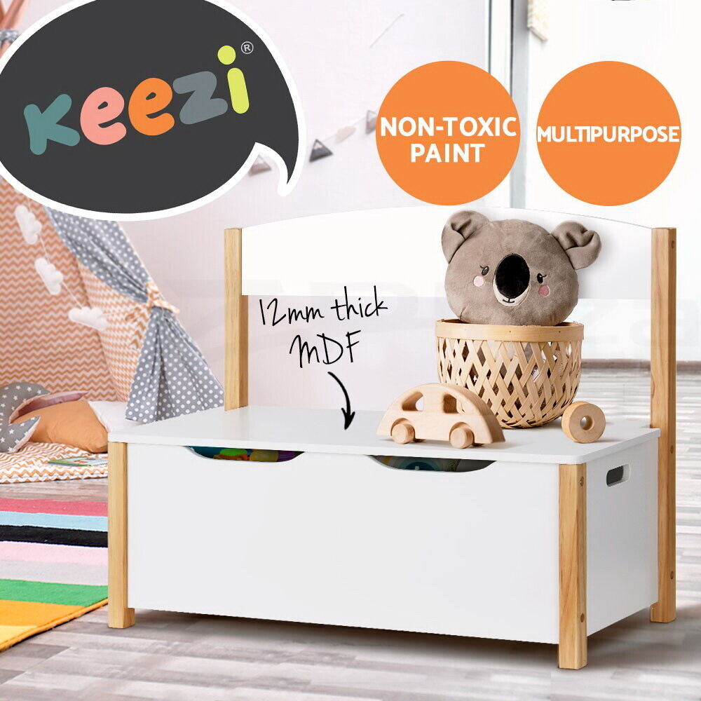 Keep your kids’ room clutter-free with our 2-in-1 Keezi kids' storage box. It’s a perfect storage solution that ensures your space remains neat and tidy with all your kids’ toys, books, and other stuff hidden inside it. It's spacious enough to accommodate all your kids’ things. Additionally, our Keezi wooden storage box flaunts a versatile design. You can use it as a storage box and a bench seat. It has a reliable backrest that allows kids to sit comfortably in a relaxed position, and the sturdy frame can hold up to 50kg of weight. It’s constructed from a 12mm thick MDF board that ensures its sturdiness and durability, and the solid wood legs keep our storage box stable and prevent shaking. Furthermore, our storage box has air gap handles for ease of use, and the smooth surface makes it easy to clean. Just a simple wipe is enough to keep it looking like new. It has smooth corners, an eco-friendly and non-toxic paint finish, and a lid with soft-closing hinges, making it safe for kids and preventing accidents. All of these amazing things make our wooden storage box a mandatory piece of furniture in your kids’ room or playroom. Purchase it today.